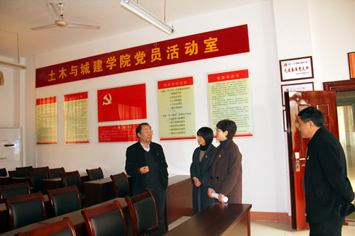 石海舟部长一行首先参观了土建学院“省级高校示范性党员活动室”,土建学院郭玉荣书记重点介绍了土建学院党员十九大精神学习活动、大学生思想政治教育工作和学生党建创新工作情况。土建学院党员活动室分为“三室两厅”,按照“五化”模式打造集议事、教育、服务、文化等综合功能的活动阵地。基本做到了阵地建设立体化、制度上墙系统化、工作资料规范化、成果展示多样化、促进发展实效化。石部长一行边看边听边询问,不时点头肯定,不时提出改进建议。