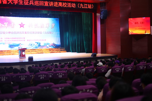 本次巡回宣讲由江西省人民政府征兵办公室主办,九江市人民政府征兵办公室、濂溪区人民政府征兵办公室和九江学院承办。九江军分区司令员宋朝阳大校、九江学院校长刘晓东、九江高校分管征兵工作的校领导出席活动,九江高校教师及2018届应届毕业生代表800余人参加活动。