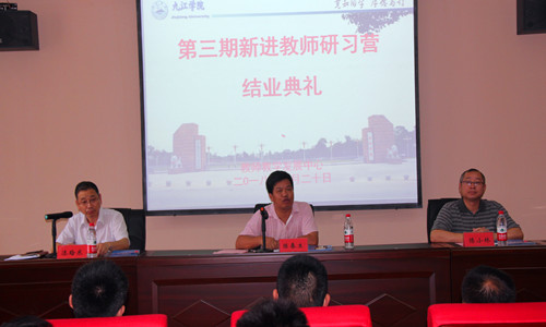 结业典礼上,陈春生副校长首先代表学校对学员们完成学习任务、顺利结业表示祝贺,希望大家珍视这段难忘的培训历程;同时对承担此次培训活动的相关人员辛勤付出表示感谢;并强调了学校对新进教师成长的重视和期望。随后,陈副校长结合自身执教经历与新进教师们分享了从教体会,指出要想当一名优秀的高校教师,不仅要保持积极进取的人生态度,还要扎扎实实做好每一件需要我们做好的事,只要这样才能在日益激烈的竞争中脱颖而出,目前学校正面临申硕、更名大学两件大事,希望大家发挥才干、大展拳脚、创造业绩。对教师的成长,他提出了三点要求:一是树立校荣我荣的信念。学校既是我们赖以生存的地方,也是我们精神有所依托的家园,更是我们人生和职业价值得以体现的重要组织,它的生存发展与我们息息相关,作为学校的一员我们要热爱它,共同建设好它;二是提升自身的专业水平。教师的职业素养与工作能力决定着学校教育教学质量。青年教师对自身的发展应高标准严要求,既要兢兢业业潜心教学也要孜孜不倦钻研科研,对在工作中遇到的困难要积极面对迎难而上,而不是一味地逃避退缩;三是发扬团结合作的精神。当今社会能够立于不败之地的人是善于在团队中合作共赢的人,各位青年老师应尽快融入集体,团结身边的同事,虚心向前辈学习,发现、改进自身不足,用积极的心态与同事们合作共事。最后,陈副校长寄语各位老师牢记一名大学教师教书育人的崇高使命,团结进取、积极奋进,为学校教育教学事业发展增添活力与动力。