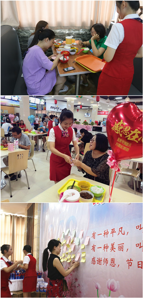 中午11点半,教工食堂人头攒动,电子屏幕上“热烈庆祝第34个教师节,祝全体教师节日快乐”的祝福映入眼帘。浓郁的节日气氛感染了每一位前来的教职工,食堂一楼琳琅满目的商品引来很多的老师驻足、询问。上楼的扶梯布满了彩带,餐桌上带着各种祝福语的心形气球流光溢彩。餐厅正前方“向辛勤的园丁致敬!向人类灵魂的工程师致敬!”的标语异常醒目。饮食服务中心精心安排的节日套餐,营养而丰富,6.66元的寓意套餐,祝福老师们事事顺心。老师们喜笑颜开,纷纷觉得后勤人想得周到。外语学院张老师开心的说到,“这么实惠而又营养的午餐吃在嘴里,暖在心里,不仅美味,更加有爱”。前来就餐的所有教职员工还幸运的得到了一份饮食服务中心精心准备的伴手礼,精致的包装盒,“桃李满天下,春晖遍四方”,九院饮食服务中心祝全体教师节日快乐的祝福让每位就餐的老师嘴角挂满了微笑。来自机材学院的退休教师王老师赞叹说,“后勤的饮食服务一直做得很好,也考虑到了我们退休职工,这次送的教师节礼物,有新鲜的桃子和李子,寓意桃李芬芳,这样的活动让我们退休教师很感动,后勤是真正地把教师们放在了心里,我很高兴。”节日的舞台上,饮食服务人还准备了一面祝福墙,到场的教师纷纷提笔祝福,写下了一段段感人的文字,有祝学院前程锦绣,有祝教师节日快乐,也有祝后勤百尺竿头更进一步的良好祝愿。上墙的所有教师均得到了后勤管理处精心准备的爱心定制礼罐。校领导中午也光临了教工食堂,并充分肯定了饮食服务中心心系教师,服务学校的一贯努力,希望饮食服务中心再接再厉,真正做到让全校教职员工满意、放心。