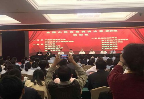 在颁奖仪式上,国家税务总局副局长任荣发为我校代表队指导教师蔡报纯颁发团体奖奖牌,中国注册税务师协会会长宋兰、江西省注册税务师协会副会长肖绩尧、江西省注册税务师管理中心副主任付小青与我校代表队合影留念。