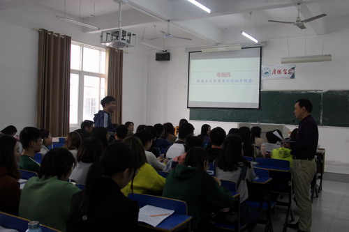 课后,杨副校长对本节课教学进行了点评。他认为赵文老师的授课层次清楚、节奏把握较好,教学信息量大,教学过程流畅。一是通过问题导入新课,利用讲时事、学生点评、教师总结这种方式,将理论知识变得生动活波,并结合社会主义核心价值观进行教学引发同学们深入思考,效果良好。二是PPT课件图文并茂、史料丰富,视频运用得当,充分吸引了同学们的注意力又帮助同学们深入理解教学内容。杨副校长还引用了三代领导人讲话以及《平“语”近人》中的经典语句与同学们共勉,希望同学们不仅在学习上,而且在“赶考、合格、毕业”的人生道路上,认真做人做事,做一个合格的社会主义建设者和接班人。