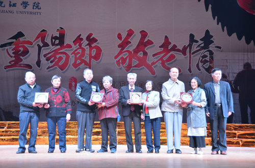 魏立平副书记为到现场的学校首届“最美老同志”王坚强、吕珍儒、李萍、欧阳祖照、周绍云、程平孙、舒晓山颁发了荣誉盘,并合影留念。