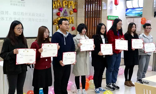 11月11日下午,九江学院官方微博、微信粉丝见面交流会暨新媒体工作室成立三周年纪念活动在我校主校区教工食堂二楼成功举办,校党委副书记魏立平,校党委委员、党委宣传部部长冯健,党委宣传部副部长万三友出席活动。九江学院官方微博、微信粉丝代表及新媒体工作室全体同学参加了本次活动。本次活动由新媒体工作室指导老师高原主持。