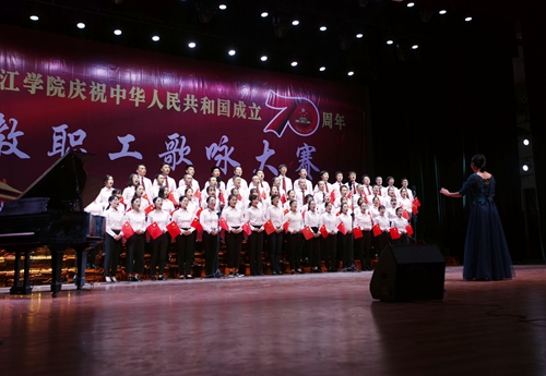 由继续教育学院、护理学院和浔东校区管理办三个部门联合表演的《中国,中国,鲜红的太阳永不落》,节奏明快、气势宏伟,唱出了中华民族的自豪感,唱响了中华民族的伟大复兴梦。现场观众在激昂奋进的歌声中,也忍不住跟着节拍高声歌唱。