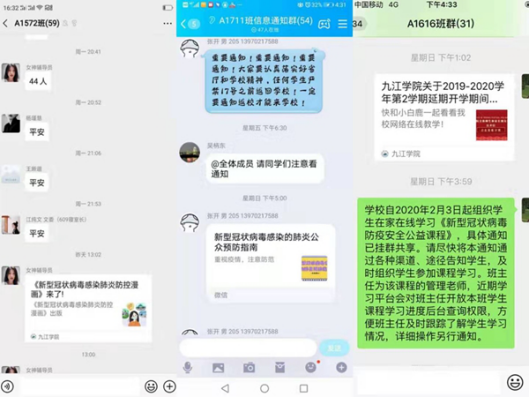 师生联动,众志成城。根据《九江学院新型冠状病毒感染的肺炎疫情防控方案》、《关于切实做好新型冠状病毒感染的肺炎疫情防控工作应急预案的通知》等文件精神,九江学院临床医学院/附属医院制定了《临床医学院新型冠状病毒感染的肺炎疫情防控措施》,对目前放假在家的学生、实习点的实习生及专职教师进行了健康状况及居住情况摸排,并对开学后的校区疫情防控提前制定了应急预案。学院党委书记张南华,党委副书记、副院长殷小平,党委副书记谷翔,还专门对20余名湖北籍的学生及5名仍在实习点学习的学生,进行了电话或现场慰问。在学生科组织下,各班级辅导员、班主任们利用微信群、官方微信等信息平台,每天向广大师生、员工发布新型冠状病毒肺炎预防指南及防控知识,并及时传达九江学院疫情期间的相关通知和要求。