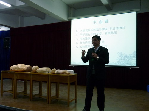 当天晚上,九江市红十字会钱逢鑫、黄哲平老师分别在文理报告厅、文友楼317室介绍了院前急救的最新知识,强调了大学生在生活中掌握急救方法的重要性,还就创伤出血、中暑、溺水、电击、意外伤害等常见急症的急救措施和要领做了详细讲解。并在现场演示了如何判断患者意识、心跳骤停需要掌握的方法及徒手心肺复苏的示范动作,并就国内外心肺复苏的一些新观点和新知识做了简明扼要介绍,他们深入浅出、诙谐幽默的讲述让同学们听得十分投入。