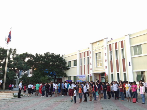 孔子学院的学生,从刚刚开始接触汉语1A水平初学者,到已经学习汉语五六年的4年级学生,从年仅六七岁的孩童到四五十岁的中年学员,大家在各自班级老师的带领下,一同站在孔子学院大楼——芳华楼门前,用身体拼出了汉字“六周年”。在队伍的最前方,有八名学员分别举起柬埔寨国旗与中国国旗。随后,大家异口同声地喊出了:“孔子学院六周年生日快乐”的口号。正是这样一批批师生共同见证了王家研究院孔子学院从建立之初遭遇的风风雨雨,到如今这六年后的成长与壮大,大家对孔子学院的爱与感激可以在面对镜头的张张自信与感动的笑脸中展现出来。