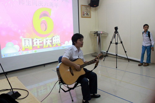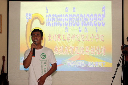 之后,大家来到教室,一同载歌载舞。在孔子学院院长谢莫尼勒(HE Chea Munyrith)的带领下,公派教师孙海瑞老师亲自弹奏吉他,为师生们献上《情非得已》、《一生有你》和《蓝莲花》这些经典、深情的中国歌曲。大家真正感受到了中国音乐的魅力,掌声不断。孔子学院的学员们也毫不示弱,纷纷献唱:孔子学院的本土志愿者教师工作人员王虎,为大家带来了歌曲《父亲的草原母亲的河》,效果丝毫不逊色于中国歌唱家。而后,3B班全体学员与教师志愿者共同演唱了《但愿人长久》,把整场气氛带进了高潮。正是这些发自内心的吟唱,正是这些真挚的笑脸,正是师生的共同努力,才成就了柬埔寨王家研究院孔子学院这六年的辉煌。耀眼的此时此刻离不开辛勤艰苦的彼时彼刻。