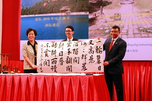 孔子学院汉语桥优秀选手在“2015年柬埔寨中国校友会联谊晚会”上展示书法作品