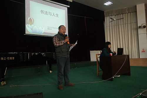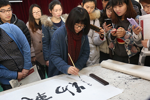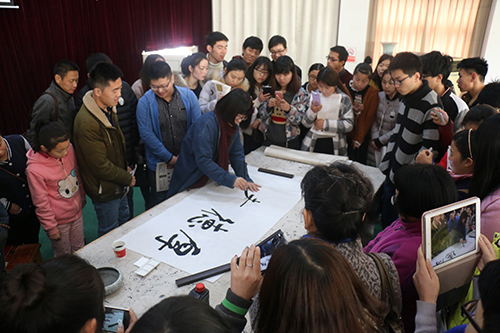 讲座中,郭教授就什么是书法、书法的审美标准、书法欣赏的方法、如何欣赏书法及书法与人生的关系进行了精彩的阐述。郭教授认为,书法是中国人的精神气象。她分别对先秦、魏晋南北朝、隋唐、宋、元、明清的书法艺术特点和精神气象进行了介绍。讲座中,郭教授着重论述了书法与人生的关系:一是增强人文素质、润化道德素质;二是培养审美情趣,塑造个人气质;三是修心养性,培养良好心态;四是调适心理,强身健体。郭教授希望大家热爱书法艺术,“品书法懂人生”。讲座后,郭教授还在现场进行了示范。