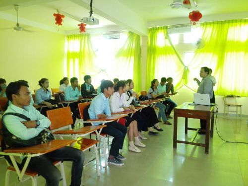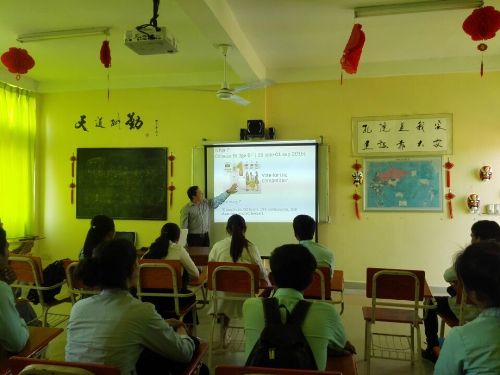 讲座由棉芷大学人文、社会与语言学院院长沙伦先生(CHIV Sarith)主讲。他为参加活动的学生讲解“汉语桥”比赛的部分内容以及自己带队参加“汉语桥”比赛的经历。他绘声绘色的讲解让学生身临其境,听得津津有味,对“汉语桥”比赛充满了向往。沙伦先生曾在2015年作为领队带领柬埔寨比赛代表团赴北京参加了“汉语桥”比赛总决赛,两名选手分获个人1、2等奖。