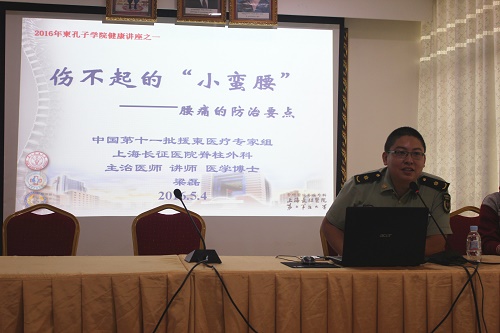 梁磊大夫为孔子学院师生做了健康医护知识讲座的第一讲——“伤不起的小蛮腰”。他通过十个小问题,为大家揭示了“腰痛的防治要点”。从“什么是腰痛”到“诊断腰痛的一般思路”再到“腰痛治疗的一般原则”,逐一递进,深入浅出,风趣幽默,为孔子学院师生娓娓道来。并着重分析了腰病的常见原因以及预防保健的手段,得到了师生们的好评。