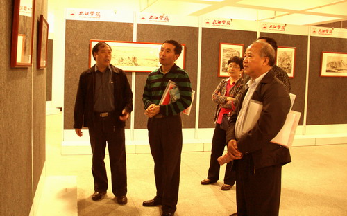 在展览现场,教务科科长汤艳、美术教研室主任冯亚兵、胡有源教授、余晓庭老师、王祖刚等老师也分别对同学们的写生作品提出了许多宝贵意见,对同学们的学习热情大家赞扬。