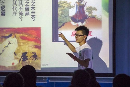 接着,青年联合会成员昆洛娜用中文祝福大家端午节安康,并用柬文详细介绍了柬埔寨的相关习俗文化。并用大量图片生动展示了中柬文化的相似之处——赛龙舟活动和吃粽子的习俗。