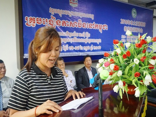 舒本苏副校长对孔子学院多年以来与亚欧大学合作开设中文系表示感谢,他指出,今年是亚欧大学将有首届汉语师范生毕业,亚欧大学已逐步成为培养汉语教师的摇篮。曾到中国四川师范大学攻读汉语国际教育硕士的柬埔寨本土汉语教师代表孙淑真分享了自己的培训心得。她立志成为一名合格的汉语教师,用实际行动帮助更多的柬埔寨人学习汉语,为中柬友谊的发展做出贡献。