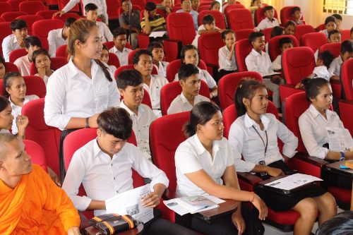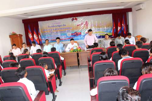 谢莫尼勒阁下在宣讲会上作了题为“‘一带一路’——语言先行”的主题演讲。他向出席的学生介绍了孔子学院的情况,他指出,特本克蒙省韩桑林大学汉语中心是孔子学院在第9个省开办的第30个汉语教学点。他还重点推介了汉语水平考试(HSK,HSKK)的情况。他介绍说,汉语水平考试是留学中国的通行证,是申请留华奖学金、夏令营的必备要求,通过考试可以在柬埔寨的中资公司、企业就较容易找了一份好的工作。他和同学们一起回顾了中柬千年友好的历程,中柬两国从公元一世纪开始交往,三国吴国就派了使者到柬埔寨,中国元朝使者周达观写就的《真腊风土记》记录了吴哥时代的繁荣,西哈努克国王和中国领导了建立了深厚的友谊,随着“一带一路”项目建设的逐步开展,对懂中文人才的需求量会越来越大,学好汉语,将会有一个好的前景。