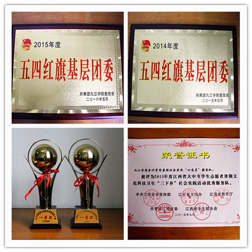 近年来,会计学院团委在思想引领、组织建设、社会实践、志愿服务等方面锐意进取、扎实推进,取得了一定的工作成效:先后获得了江西省暑期三下乡社会实践“先进服务队”称号;连续多年获得九江学院“五四红旗基层团委”称号;先后被中国扶贫基金会授予“爱心团体”称号,多次被九江学院授予“优秀志愿服务队”、“最美志愿者服务队”荣誉称号;多次获九江学院各项比赛一等奖。