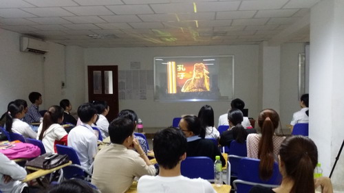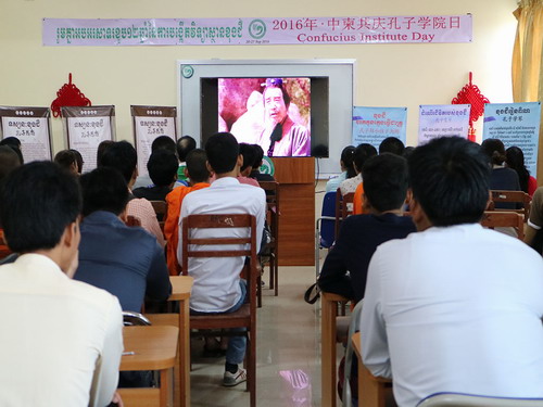 此外,柬埔寨孔院本部及各教学点还开展了丰富多彩的汉语教学和文化推广活动,如本部举办了“穿越时空体验孔子课堂”、 “我与孔子的对话”和播放纪录片《孔子》的观影活动;亚欧大学中文系举办 “孔子的故事”讲座;茶胶青年联合会汉语中心和棉芷大学中文系分别举办“看电影,学汉语”活动;金边国际大学汉语中心开展“鸟瞰中国“观影活动;马德望国际大学汉语中心举办“中国电影展”活动;本部教师、暹粒吴哥高中孔子课堂和西哈努克省高级中学汉语中心教师体验了“亡人节”感恩祈福活动,体验柬埔寨亡人节活动。谢莫尼勒院长和夏修龙院长受中柬友好广播电台和国际大学电视台邀请,介绍了孔子、孔子学院、汉语教学及中柬文化交流情况,与听众互动、答疑,取得了较好的效果。(黄书)
