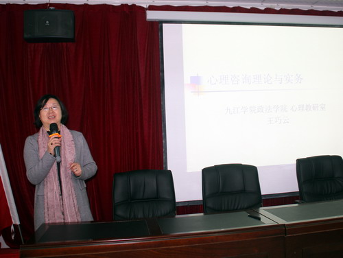 研修活动的内容丰富,安排紧凑。11月19日上午8:30,研修班首先举行了一个严谨而又简短的开办仪式,政法学院曹钟安副院长、市心理学会黄福林会长分别代表政法学院和市心理学会作了讲话。9:00——12:00,王巧云教授、王彦博士分别作了《心理咨询的理论与实务》、《心理测量的理论与实务》主题报告。下午1:30——4:00,黄国红和邵悦老师联合主持了《团体心理辅导基础理论与实操训练》。四位老师的精彩主题报告及实操训练博得了研修学员们的阵阵掌声和高度赞誉。午间,研修学员们还参观、考察了九江学院政法学院各专业心理实验室,心理教研室主任黄金生老师为大家进行了详细的讲解,并为部分学员安排了心理测验的体验。