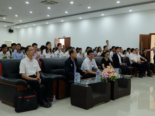 11月28日上午,柬埔寨王家研究院孔子学院2016年第二届“魅力汉语”之“我眼中的中国”中文演讲比赛在亚欧大学金色大楼13楼多功能厅举行。柬埔寨王家研究院孔子学院院长谢莫尼勒(Chea Munyrith)、中方院长夏修龙、亚欧大学校长谢索皮(Chea Sopheap)、金边免税店总经理阴云先、东南亚电信公司总经理助理邱功成、中国文化中心主任全彦钢、柬埔寨人力公司副总经理温小勇及亚欧大学师生300余人观看了比赛。