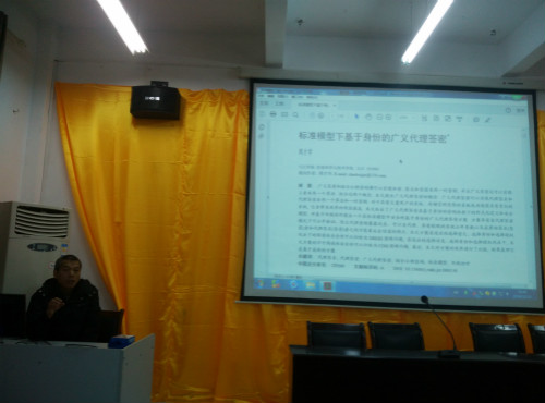 周才学老师在密码学研究方面取得了丰硕的成果,今年就有3篇文章被SCI收录。讲座开始,周老师就自己的讲座题目“标准模型”、“基于身份”、“代理签密”给大家做了详细的解析。同时也介绍了基于身份的广义代理签密是基于DBDH、CDH两个困难问题而设计的方案,通过与其它方案比较,这个方案对有大量用户的系统、存储空间受限的情况有较好的效果。
