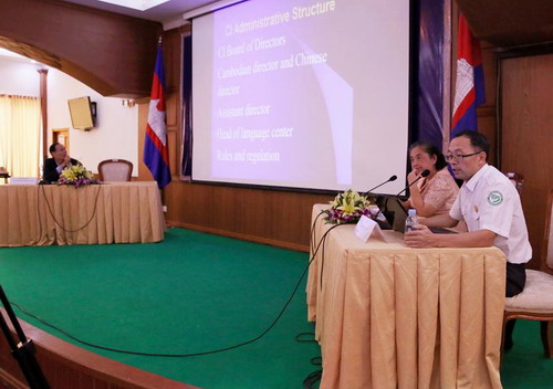 柬埔寨王家研究院是柬埔寨孔子学院的挂靠单位,孔子学院建院7年来,发展迅速。应王家研究院的要求,夏修龙院长的英文作了题为“团队精神在孔子学院建设和发展中的作用”的专题讲座,他从孔子学院发展的现状、孔子学院的管理模式、中国人的合作理念以及孔子学院在团队合作上的经验和体会等方面进行了阐述,他最后感谢王家研究院提供给孔子学院良好的发展平台以及给予孔子学院的大力支持。