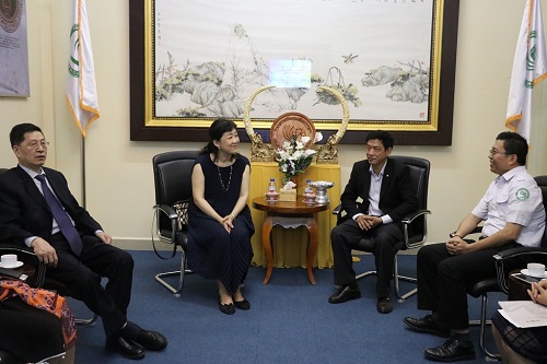 6月29日上午,江苏国际文化交流中心秘书长李翎女士、副秘书长周越波女士及“江苏杯”汉语比赛东南亚赛区顾问程爱民教授等一行4人到访柬埔寨王家研究院孔子学院。柬埔寨王家研究院副院长逊春文院士(H.E.SUM Chhumbun)与柬埔寨王家研究院孔子学院院长谢莫尼勒(H.E.CHEA Munyrith)、院长助理陈晶雯老师热烈欢迎李翎女士一行。