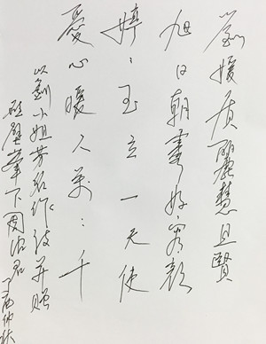 诗写到:“许郎高悬壶,仁爱济黎庶,伟业口碑禄,好景富有余。”;“刘媛质丽慧且贤,旭日朝霞好容颜,婷婷玉立一天使,爱心暖人万万千。”据了解,这位患者因反复腹痛伴寒战、高热半月入住临床医学院/附属医院行肝脓肿穿刺引流术后因血糖波动转入内分泌科继续治疗。在主管医生许仁炜的精心诊治和护士的细心护理下,周老师的病情迅速得到了控制,血糖稳定,他和老伴非常开心,连连称赞内分泌科医护人员精湛的医术和优质的护理,并与医护人员们建立了“不是亲人胜似亲人”的感情。