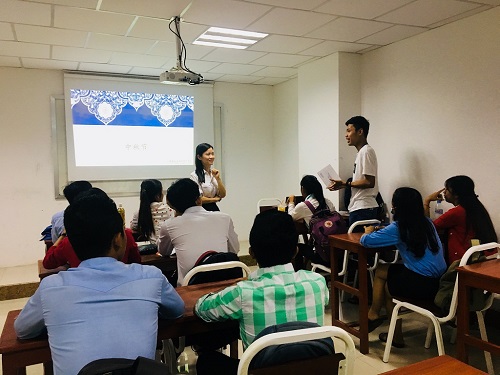 又是一年中秋时,花好月圆乐团圆。10月4日晚,柬埔寨王家研究院孔子学院亚欧大学中文系举办“花好月圆乐团圆”2017年中秋节主题文化体验活动,该活动由中秋节文化讲座、中秋月饼品尝、中秋知识竞赛和中秋诗词歌曲教学四部分组成,由亚欧大学中文系公派教师陈惠玲老师主讲。亚欧大学中文系全体教师和部分学生40余人参与。