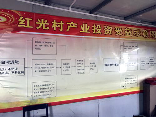 红光村是彭泽县脱贫攻坚产业示范基地,主要通过养殖产业党小组,发展贫困户养殖户和普通户养殖户等模式开展贫困户产业帮扶。目前,已有23户贫困户发展台湾泥鳅和龙虾养殖近20亩,其中台湾泥鳅直接实现贫困户每亩增收1.3万元到3万元,龙虾实现贫困户增收每亩4000元。