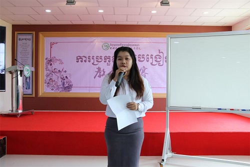 11月4日上午,为了提升孔子学院汉语教师志愿者的汉语教学水平,不断提高教学质量和专业素质,促进孔子学院教师教学能力的提高,由柬埔寨王家研究院孔子学院主办的2017年孔子学院汉语教师志愿者教学竞赛在孔子学院本部三楼会议室隆重举办。柬埔寨王家研究院孔子学院中方院长夏修龙教授和柬方院长苏碧娜(VUTH Sopheakna)女士出席本次教学竞赛活动,来自孔子学院本部、下属孔子课堂和教学点的80名汉语教师参加了此次活动。