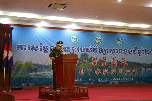毛树潘司令和莫云院长分别在致辞中感谢中国国家汉办派出巡演团来柬演出,表示演出活动将进一步促进中柬两国的交流,让柬埔寨民众特别是部队官兵更多了解中国文化和艺术。陈国宏副校长感谢周到的安排和接待,期待借此机会进一步加强交流和合作。
