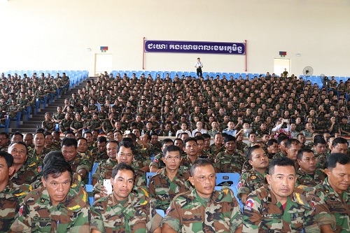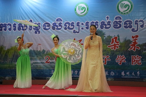 11月13-14日,由中国国家汉办主办、扬州大学和柬埔寨王家研究院孔子学院承办的“好一朵茉莉花”巡演团走进柬埔寨军营,分别在柬埔寨金边警备旅和陆军学院成功举办了两场文艺演出。中国驻柬埔寨大使馆李宁亚武官、金边警备旅司令毛树潘将军(MAO Sophan)、王家军陆军学院院长莫云将军(MAM Yoeun)、扬州大学副校长陈国宏教授、柬埔寨王家研究院孔子学院中方院长夏修龙教授、柬方院长苏碧娜(VUTH Sopheakna)女士及金边警备旅和陆军学院2000余名官兵观看了演出。