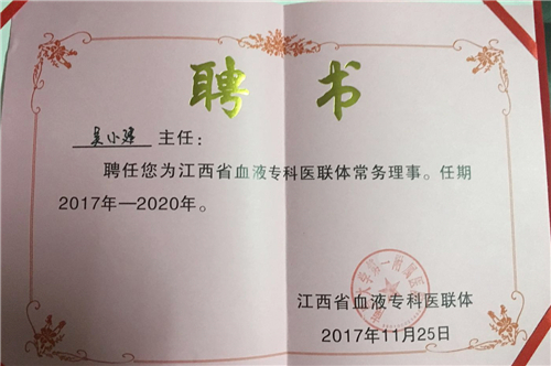 为调整优化医疗资源结构布局,提升基层服务能力和医疗服务体系整体效能,更好的实施分级诊疗,满足群众健康需求,近日,江西省血液专科医联体在南昌成立,省卫计委副主任程关华出席成立大会。临床医学院/附属医院血液科成为首批成员单位,吴小建主任当选为常务理事,任期4年。