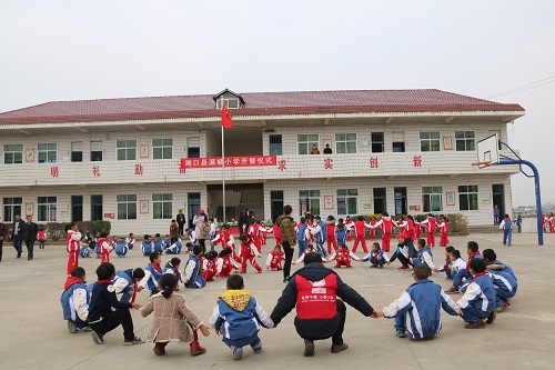 在开餐仪式前,我校师生志愿者们在课间休息期间教孩子们唱歌、跳舞、手语,和孩子们玩丢手绢、拔河等游戏,并和同学们攀谈起来,了解了他们学习与生活近况,鼓励他们要好好学习,加强锻炼,并祝福他们身心健康、快乐成长、学业有成。孩子们的眼神充满了坚定及对未来的憧憬。