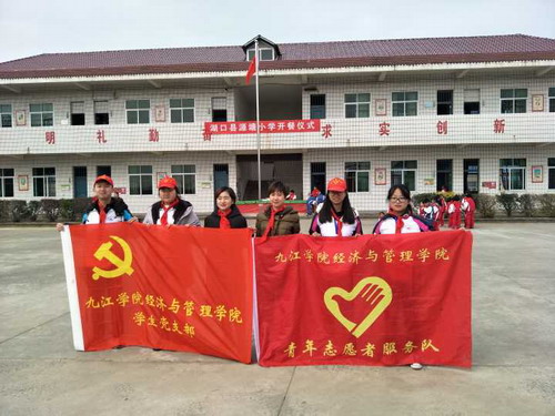 时值第32个国际志愿者日之际,12月6日江西省“免费午餐”爱心公益项目落户湖口县源塘小学,免费午餐项目江西执行长闵跃翔带领的爱心团队会同我校后勤管理处、经管学院志愿者来到源塘小学开展免费午餐公益行动。湖口县县委常委、宣传部长邱玉林,九江市文明办副主任易本钰,我校饮食服务中心主任蔡飞等出席了开餐仪式,开餐仪式由源塘小学胡校长主持。