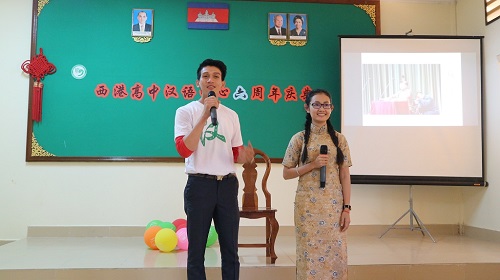 12月17日下午,柬埔寨王家研究院孔子学院西哈努克省高级中学汉语中心成立六周年庆典活动在西港高中隆重举行。西港省教育厅官员林江(Lin Kheang)、西港高中副校长詹多德(Chan Tradeth)、西港港华学校校长吕俊侨、西港生命大学教师丁约丰、西港鄂尔多斯鸿骏电力有限公司主任张波、西港海涛旅游经理王明超以及西港高中汉语中心师生和社会民众100余人参与了此次庆典活动。
