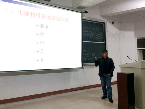 刘平辉教授的讲座主题是《土地利用总体规划编制实务》,他围绕国家、省、市、乡、县的土地利用总体规划体系,讲述了各级规划编修的工作方法和工作步骤,尤其重点介绍了市级、乡级、县级规划的编修要点。刘教授还以临川区土地规划的编制为案例,详细阐述整个编制过程。刘教授讲座中案例旁征博引、重点突出、思路清晰、深入浅出、让在场师生详细了解了土地规划编制工作的整个体系,受益匪浅。