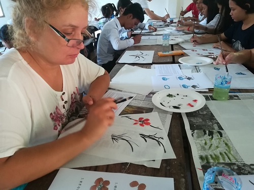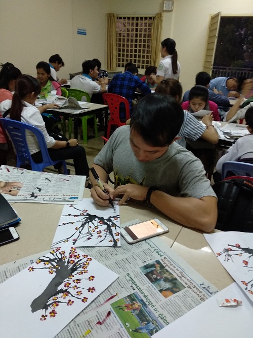 参加此次活动的桑美秀(Som Sokkeav)同学表示:我看过很多中国画,虽然觉得很美,但是看不懂,也从来没有画过。这次在汉语中心参加活动,不但体验到了中国艺术的美感,也亲自画了中国画,收获很大。(文/赵丽萍  摄/张颖 李智)