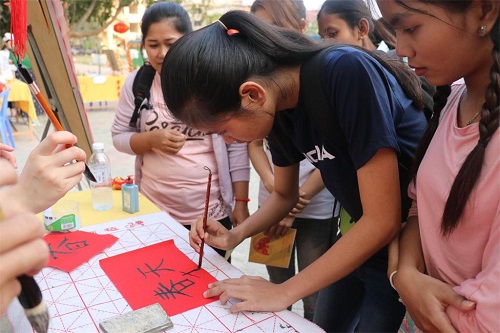 夏修龙院长感谢学生们的热情参与,并简要向学生们讲解了中国春节的习俗,并鼓励学生们好好学中文,将来有机会去中国留学,体验中国的新年。苏碧娜院长为学生们的到来表示欢迎,希望各位师生今天玩得开心。同时,她感谢柬埔寨孔子学院辛勤工作的中国教师,感谢大家对孔子学院工作的支持。随后两位院长向现场的师生和家长们致以诚挚的新春祝福!