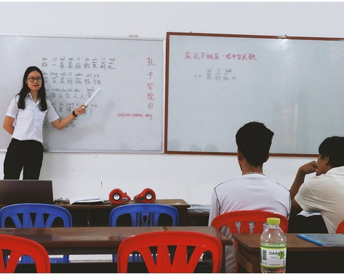 10月5日上午,柬埔寨皇家科学院孔子学院马德望高棉大学汉语中心围绕“庆孔子诞辰,唱中国民歌”的主题开展了“孔子学院日”系列活动之传唱中国民歌----《茉莉花》,现场有汉语教师志愿者荆蓉、刘思思与汉语中心学生20余人。