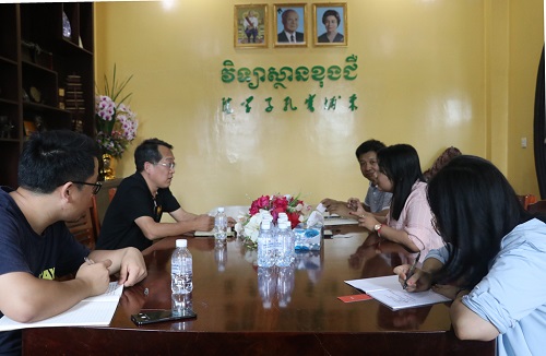 10月22日,武汉市新新图书有限公司王奎英董事长一行两人访问了柬埔寨皇家科学院孔子学院,柬埔寨皇家科学院孔子学院中方院长柴克清、柬方院长苏碧娜(Vuth Sopheakna)在孔子学院一楼会议室接待来宾,双方展开友好会谈。