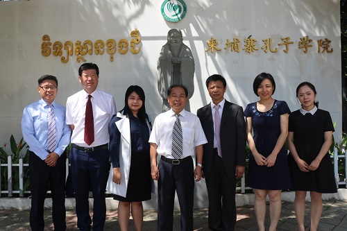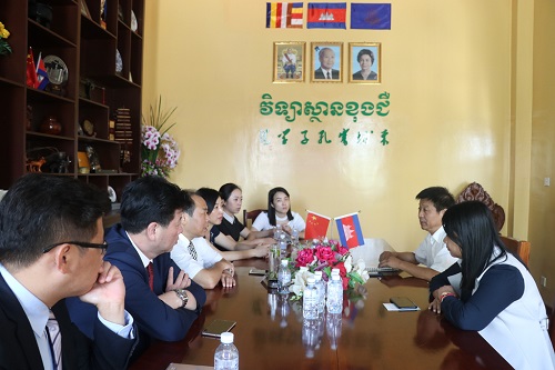 10月30日上午,九江市委常委、宣传部部长潘熙宁率领九江市代表团访问了柬埔寨皇家科学院孔子学院,代表团成员有:九江市发改委副主任戴玲芳,九江市教育局副局长何明,庐山市委常委宣传部部长刘华芸,九江市委宣传部办公室主任文珍珍,九江市外办科长段强。柬埔寨皇家科学院孔子学院中方院长柴克清、柬方院长苏碧娜(Vuth Sopheakna)于一楼会议室热情接待来宾,双方展开友好会谈。