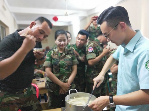 当晚,金边警备旅孔子课堂教室充满了柬埔寨士兵的欢声笑语,士兵学生们每天都有繁忙的工作和训练,但仍然坚持学习汉语,十分踊跃地参与到此次春节文化体验活动中来,活动场面热闹非凡。活动由警备旅中方负责人魏来老师宣布开始,第一项内容是介绍春节传统文化习俗。魏老师指着白板上提前写好的新年祝福语,一边带领大家读、写,一边解释意思,各位同学听得十分投入,积极和老师互动,并认真地记下了笔记。