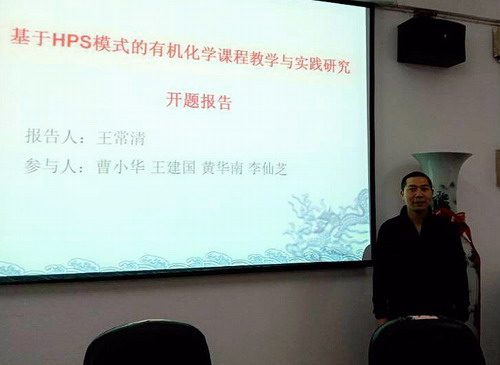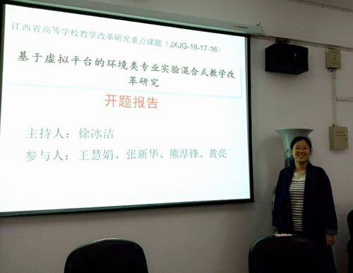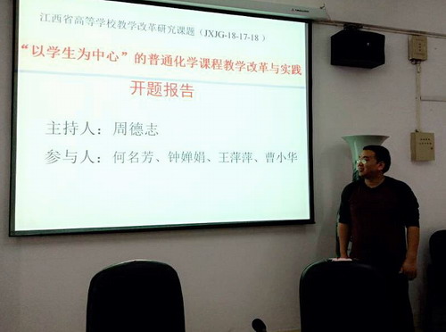 报告会上,2018年立项的江西省教改课题《“以学生为中心”的普通化学课程教学改革与实践》负责人周德志老师,《基于HPS模式的有机化学课程教学与实践研究》课题负责人王常清博士,《基于虚拟平台的环境类专业实验混合式教学》课题负责人徐冰洁博士,依次从各自课题的立项依据、研究内容、研究方法、创新点、进度安排和预期成果等方面进行了10分钟左右的PPT阐述。