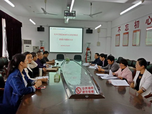 为加强省教改课题的过程管理,提高课题研究的质量,充分发挥教改课题研究对教学的促进,3月20日下午,化环学院在向学楼五楼会议室举行2018年江西省教改课题开题报告会。会议邀请了5位专家评委,教务处教改教研科虞耀君教授担任专家组组长,占昌朝教授、吴传保副教授、刘祥丽副教授、张蔚萍副教授担任专家组成员。课题组全体成员和教师代表参加了开题报告会。