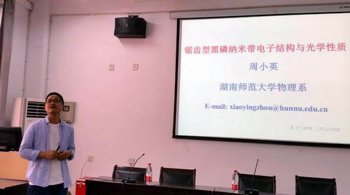周光辉教授、周小英博士、肖贤波教授分别作了题为“Graphene-Fundamental and Device Physics”、“锯齿型黑磷纳米带电子结构与光学性质”、“拓扑半金属纳米条带磁电输运”的报告,三位教授从凝聚态物理的前沿研究方向,在二维材料的构造及其微结构、纳米特性、光学性能等方面给大家带来了最新最前沿研究成果的阐述。