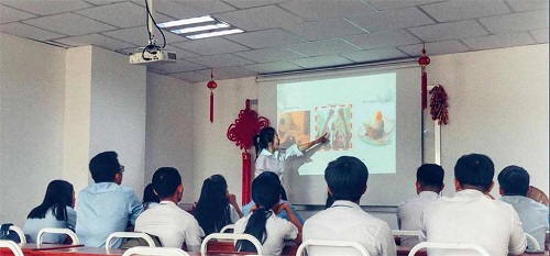 讲座开始,柴艺斐老师讲解了“端午节”的来历,并结合爱国诗人屈原的伟大事迹,为接下来端午节习俗的由来作铺垫。紧接着,柴艺斐老师依次展示端午节的习俗的图片“吃粽子”、“赛龙舟”、“挂香包”、“挂艾草菖蒲”、“贴钟馗像”等,引导学生说出端午节为何会有这些习俗。学生王杰义(Cheae Heng)说:“赛龙舟是当时屈原投河自尽报国,人们要划着船去找屈原的尸体啊!”学生杨金束兴(Ear Kim Sokheng)说:“吃粽子是为了把饭团丢给河里的鱼,避免吃屈原的尸体啊!”由此可见,有了屈原的事迹作铺垫,学生对端午节习俗的由来已更加了解。