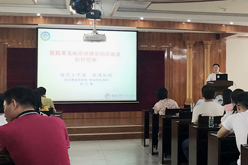 邀请了南昌大学第一附属医院感控处副处长向天新博士前来授课。向天新博士以耐药菌为切入点,结合自己的临床经验向大家详细讲解了院内感染常见病原体的诊断策略及防控措施。临床医学院/附属医院院感科杨秀玲老师就医院环境物体表面清洁与消毒进行了生动的讲解。
